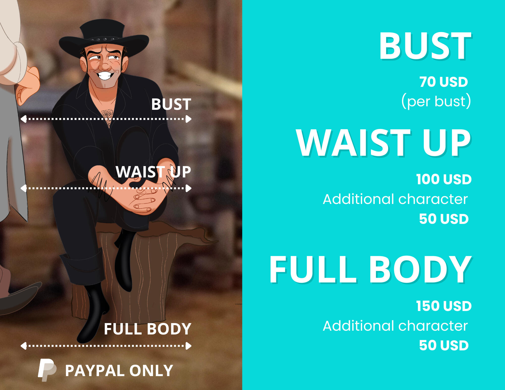 Please note that the price list is for personal commissions only. Artist will not be accepting commissions for commercial purposes at this time.